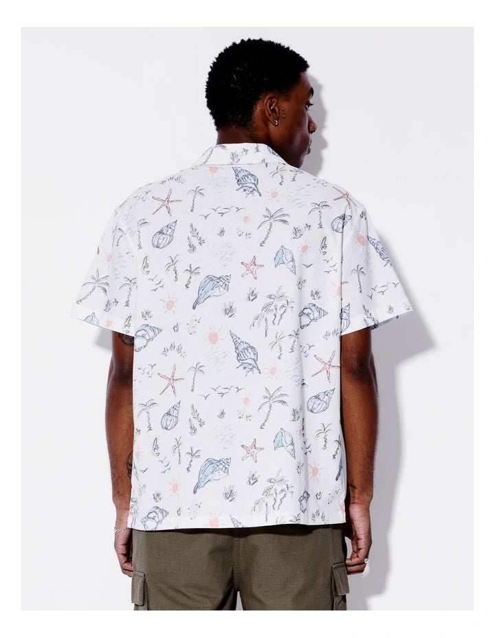 Kenji Coral Coast Print Short Sleeve Oversize All Gender Shirt in White
